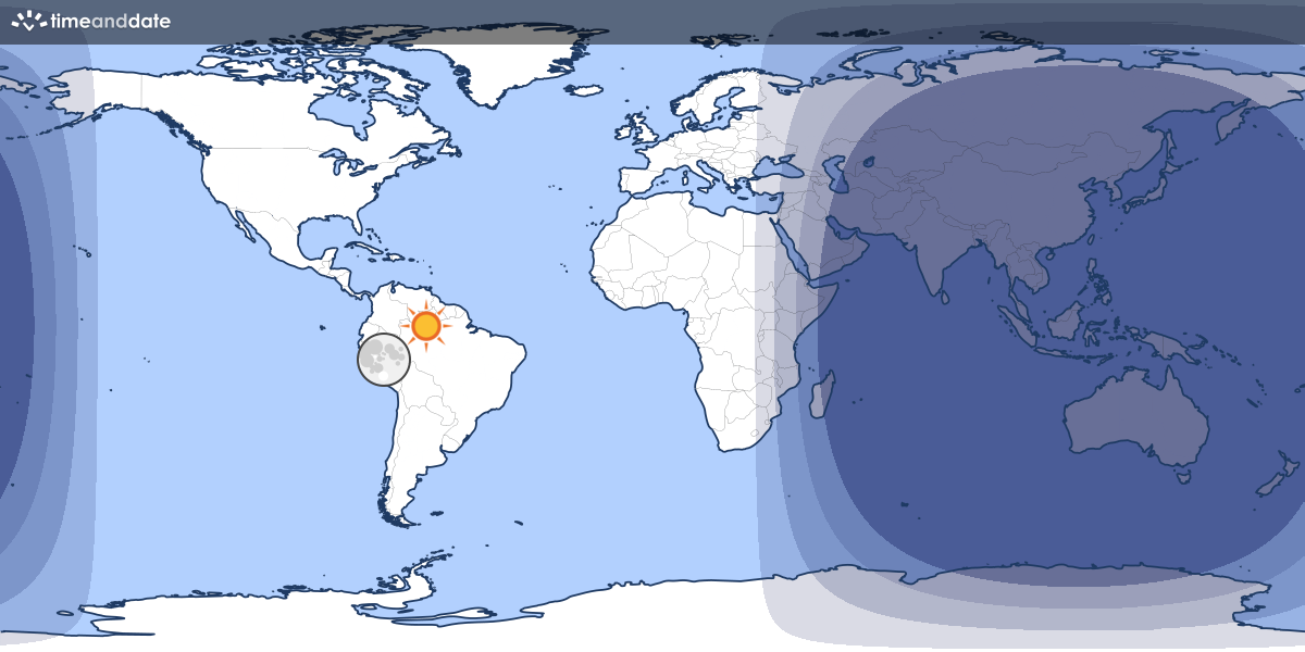 Kartet viser dag og natt på jorda med solas og månens posisjon akkurat nå.